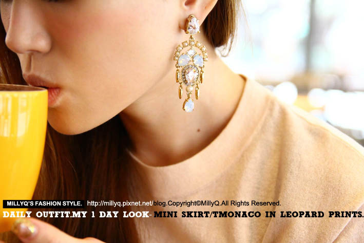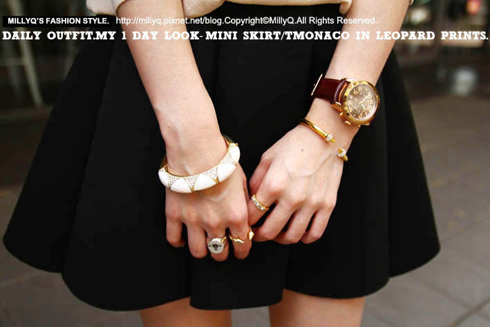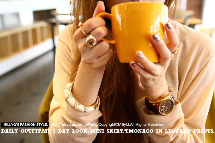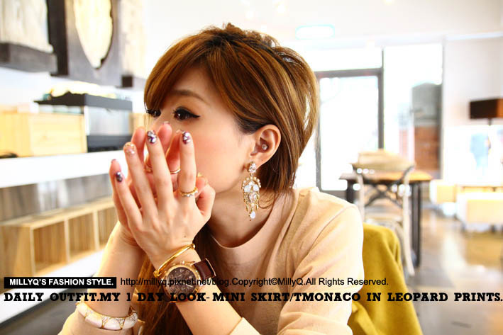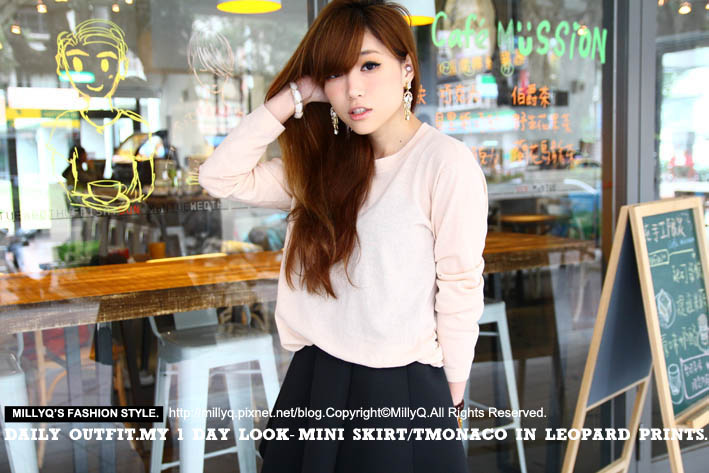 粉嫩的上衣顏色搭配充滿玩興的百褶裙下半身 不想太鄰家的印象就加入豹紋高跟鞋與華麗飾品的衝擊♥